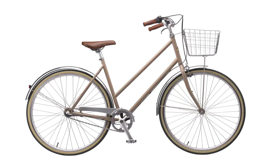 Det enkle, slanke stel, de tynde dæk med hvid kant samt sadel og greb i læderlook giver cyklen et let og elegant udtryk, der vil pynte på cykelstien. Den diskrete trådkurv er prikken over i'et.